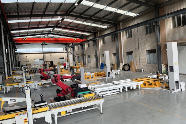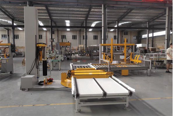 該線體涵蓋紙箱的開封箱機、自動裝箱機、自動供棧機、碼垛機器人、在線纏繞機、輸送機等6大單元,三線并行,實現(xiàn)了全無人化操作,是完整的全自動化包裝流程典范。