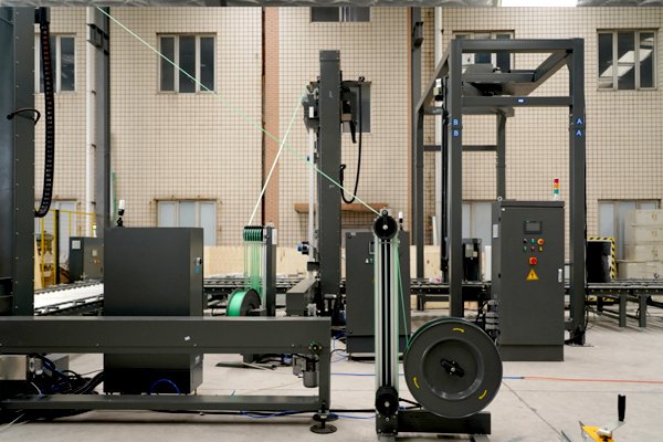 瓦楞紙板捆扎纏繞包裝線2臺頂壓式托盤穿劍捆扎機、1臺搖臂式纏繞包裝機以及若干滾筒輸送機組成。針對瓦楞紙板比較蓬松的特性,該線體配備了帶下壓功能的托盤捆扎機,最大壓力可達(dá)500kg,有效降低包裝體積,同時讓包裝物更加緊實,防止運輸過程中的散落。