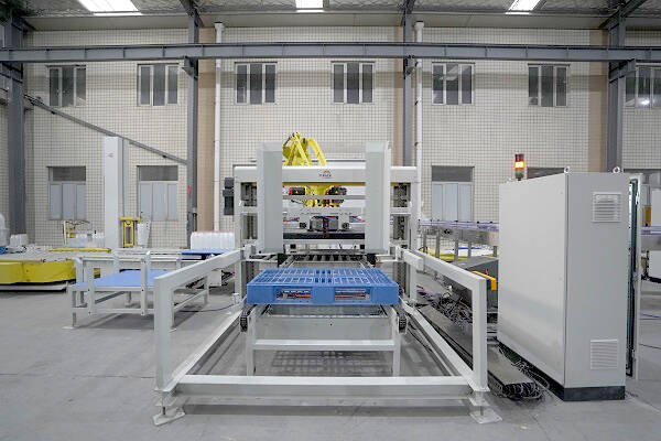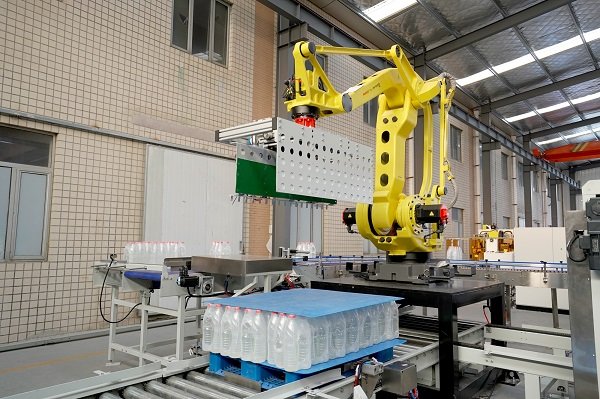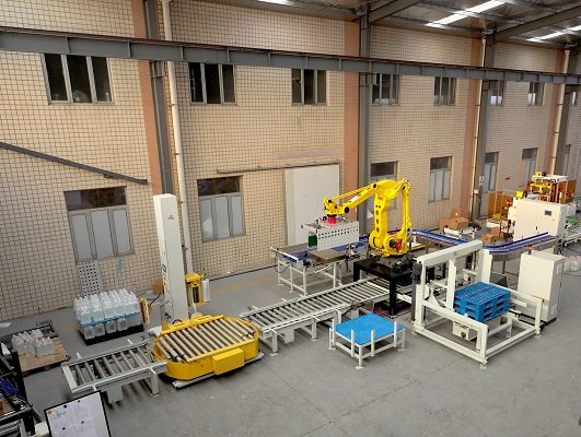膜包水碼垛纏繞包裝線是由供棧機(jī)、理料線、碼垛機(jī)器人、墊板倉(cāng)以及在線纏繞機(jī)等設(shè)備組成。該線體常用于礦泉水、飲料、啤酒、瓶裝調(diào)味料等產(chǎn)品碼垛使用。鑒于前端罐裝產(chǎn)品的效率比較高,碼垛機(jī)器人采用庫(kù)卡大負(fù)載機(jī)器人,同時(shí)配以復(fù)合式抓手,即可實(shí)現(xiàn)一列產(chǎn)品一起抓取,也可以同時(shí)抓取墊板,占地面積小,成本低。