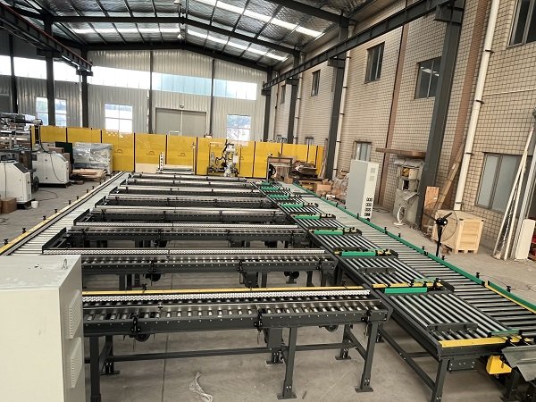 該線體主要功能是對卡丁車和賽車輪胎進行裝箱和碼垛。線體最大亮點是,客戶一共有8條產(chǎn)線4種紙箱尺寸同時混產(chǎn),針對客戶的現(xiàn)實情況,艾訊采用了機器人+動力料倉+自適應折底封底機的結構,通過信號交互,來確定取哪款紙箱,開哪款紙箱,再通過信號識別,將紙箱輸送到指定的裝箱工位。同時該線體還配備了實時貼標加在線打印功能,通過和上位機的實時通訊,來確定紙箱需要打印的標簽內(nèi)容。